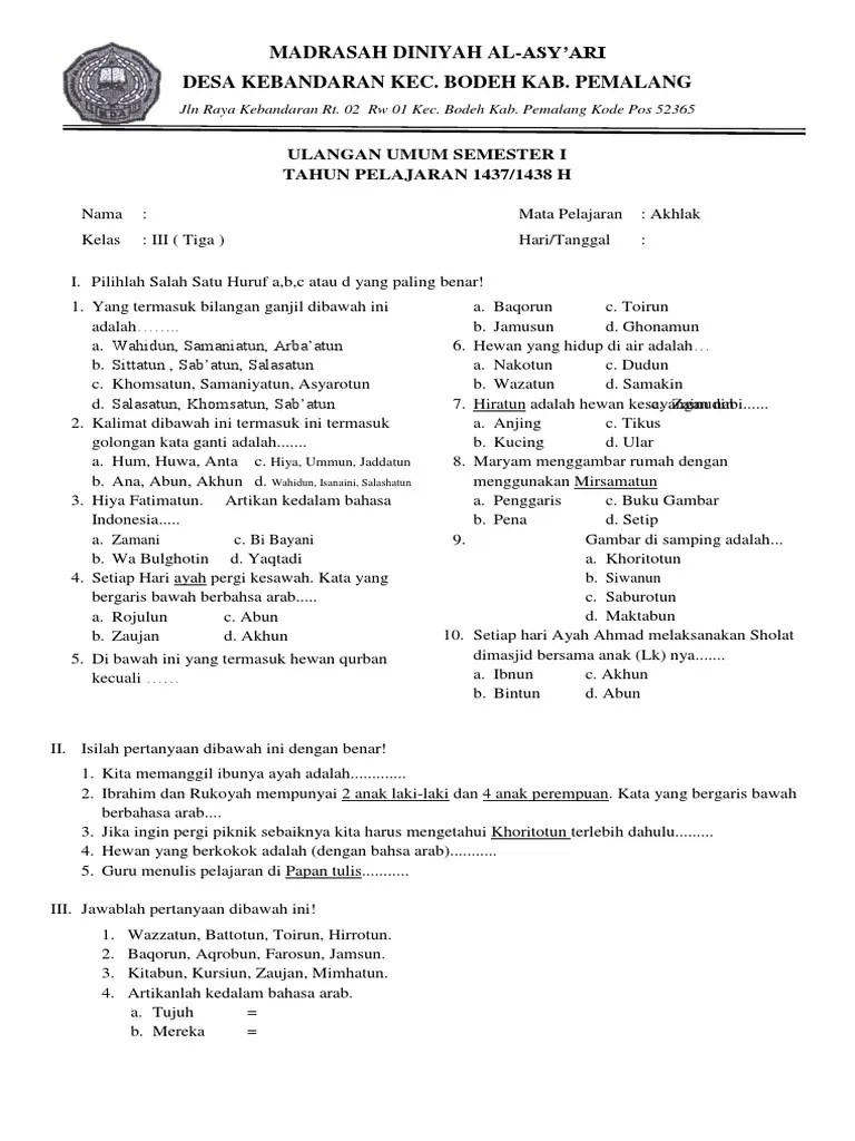 Soal bahasa arab kelas 2 semester 2 pdf.